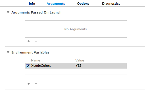 在Scheme中配置Environment Variables, 添加参数XcodeColors为YES.如下图